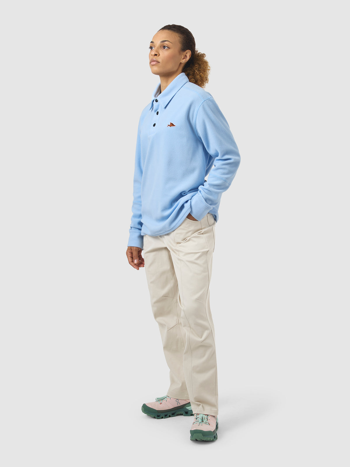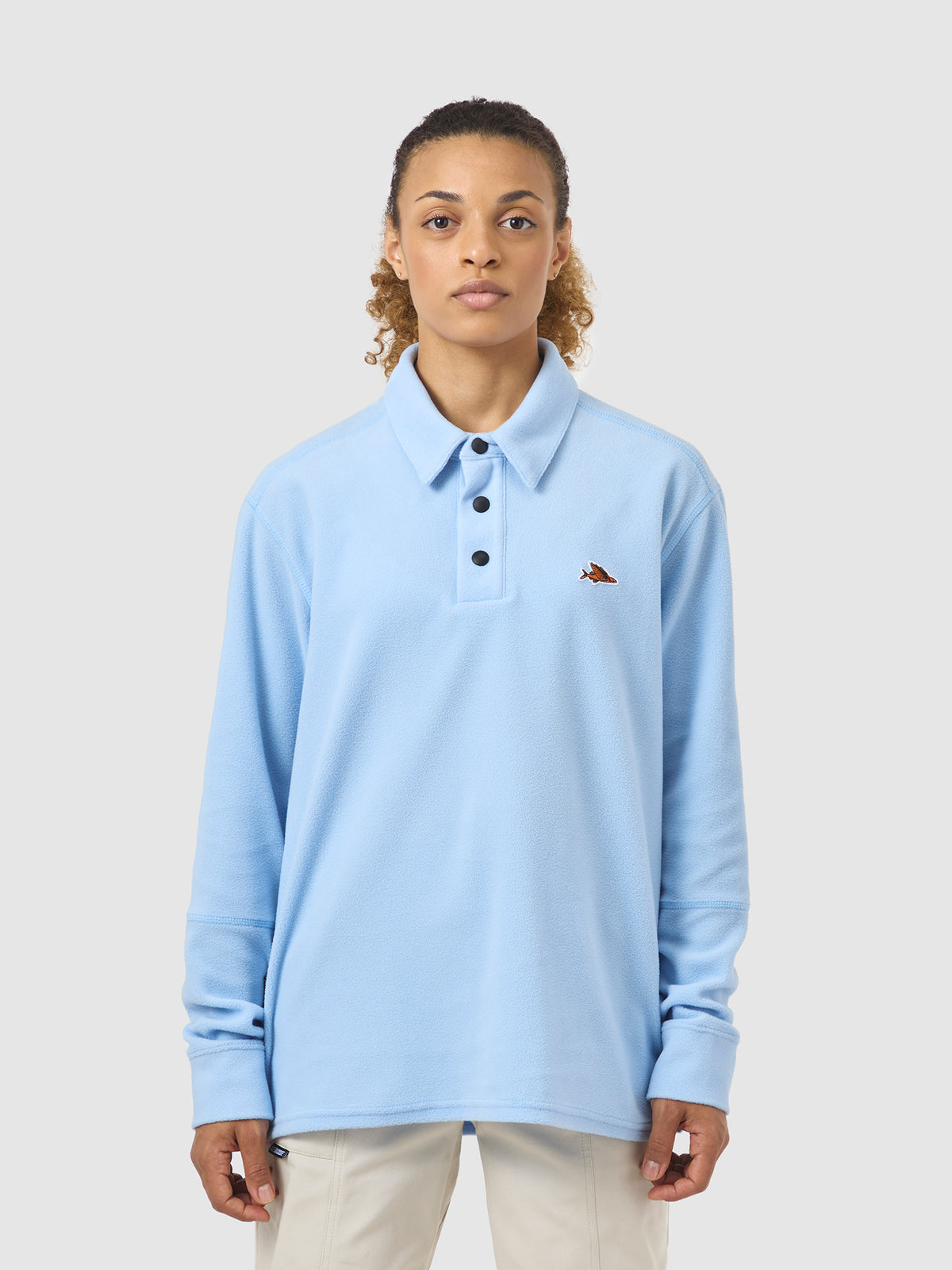 A long-sleeve polo shirt that’s technical enough to accompany you hiking up mountains but looks good enough for the café terrace, Leslie will become a new staple of your activewear wardrobe. Constructed from a carefully selected light fleece fabric, it has a classic polo shirt front with snap-closures at the neck. Our Forever Outsiders flying fish motif is a reminder that adventure is always just around the corner.