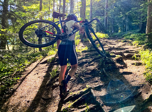 With every meter the view opens up, and towards the top we see nearby Lago Lugano and the 4000-meter peaks of the Monte Rosa. Arriving at the pass of Alpe Giumello, just 250m shy of the peak, completing a 1330m climb feels good and we decide to treat ourselves to some traditional brasato al vino con polenta (beef and grits) in one of the alpine huts, before descending deeper into the backcountry. Crossing through several small hillside villages on our way back, where again we enjoy switchbacks, bathed in the evening sun and taking in a stunning view across the lake towards Dervio.