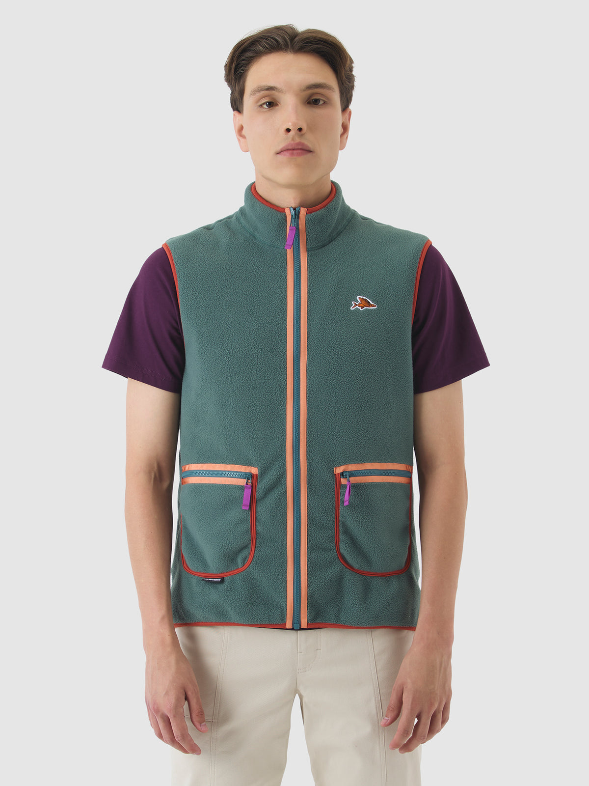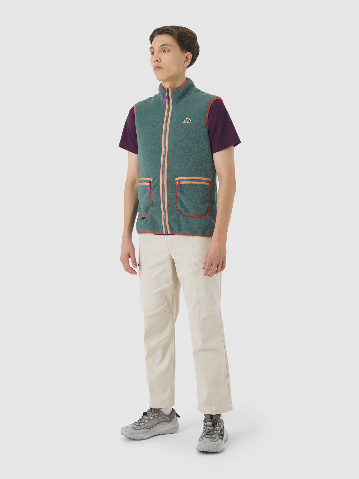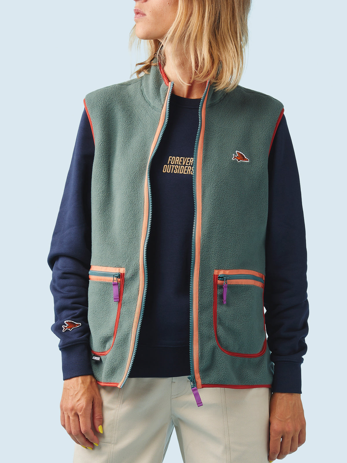 Designed for all weathers, a unisex fleece gilet made with 100% recycled nylon. With a nod to 1990s hiking style, Cyrielle is a versatile piece of kit suitable for travelling up high or getting down low. Quick-drying, lightweight and insulating, the durable brushed fabric can be worn over or under any number of layers. A high neckline provides added insulation and there are two patch cargo pockets with zip closures for all-day essentials.